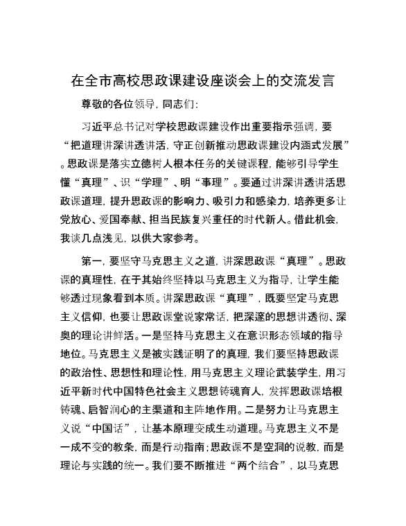 在全市高校思政课建设座谈会上的交流发言 2024-09-02 Word模板 99 购买前,请一定要先点击这里看看,欢迎持续关注,精彩模板每天推送 预览结束,本文件为word文档,一共4页,共1587字,请购买后,下载后查看 购买前,请一定要先点击这里看看,欢迎持续关注,精彩模板每天推送 资源下载下载价格59 RMBVIP免费升级VIP点击检测网盘有效后购买有任何充值和下载问题请加微信:xuexixuexi66 0 演讲发言