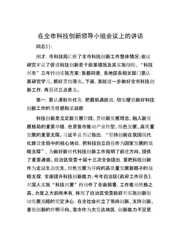 在全市科技创新领导小组会议上的讲话 2024-09-02 Word模板 81 购买前,请一定要先点击这里看看,欢迎持续关注,精彩模板每天推送 预览结束,本文件为word文档,一共6页,共2872字,请购买后,下载后查看 购买前,请一定要先点击这里看看,欢迎持续关注,精彩模板每天推送 资源下载下载价格59 RMBVIP免费升级VIP点击检测网盘有效后购买有任何充值和下载问题请加微信:xuexixuexi66 0 演讲发言