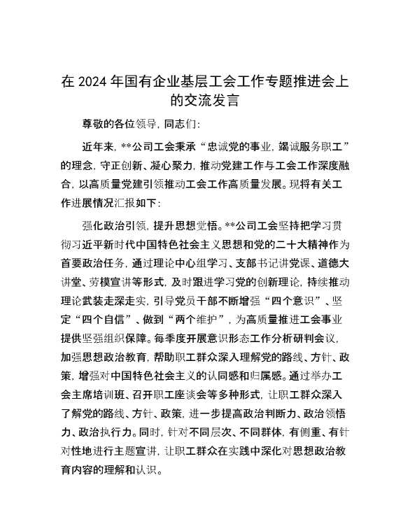 在2024年国有企业基层工会工作专题推进会上的交流发言 2024-09-15 Word模板 70 购买前,请一定要先点击这里看看,欢迎持续关注,精彩模板每天推送 预览结束,本文件为word文档,一共5页,共2121字,请购买后,下载后查看 购买前,请一定要先点击这里看看,欢迎持续关注,精彩模板每天推送 资源下载下载价格29 RMBVIP免费升级VIP点击检测网盘有效后购买有任何充值和下载问题请加微信:xuexixuexi66 0 演讲发言