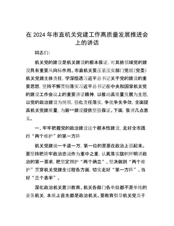 在2024年市直机关党建工作高质量发展推进会上的讲话 2024-09-15 Word模板 80 购买前,请一定要先点击这里看看,欢迎持续关注,精彩模板每天推送 预览结束,本文件为word文档,一共8页,共3318字,请购买后,下载后查看 购买前,请一定要先点击这里看看,欢迎持续关注,精彩模板每天推送 资源下载下载价格29 RMBVIP免费升级VIP点击检测网盘有效后购买有任何充值和下载问题请加微信:xuexixuexi66 0 演讲发言