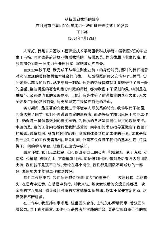 在甘肃前进集团2024年实习生培训班开班仪式上的发言:从校园到牧场的蜕变 2024-09-15 Word模板 75 购买前,请一定要先点击这里看看,欢迎持续关注,精彩模板每天推送 预览结束,本文件为word文档,一共2页,共1151字,请购买后,下载后查看 购买前,请一定要先点击这里看看,欢迎持续关注,精彩模板每天推送 资源下载下载价格29 RMBVIP免费升级VIP点击检测网盘有效后购买有任何充值和下载问题请加微信:xuexixuexi66 0 演讲发言
