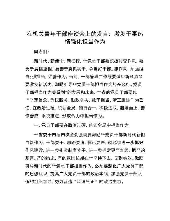 在机关青年干部座谈会上的发言:激发干事热情 强化担当作为 2024-09-15 Word模板 82 购买前,请一定要先点击这里看看,欢迎持续关注,精彩模板每天推送 预览结束,本文件为word文档,一共7页,共3592字,请购买后,下载后查看 购买前,请一定要先点击这里看看,欢迎持续关注,精彩模板每天推送 资源下载下载价格29 RMBVIP免费升级VIP点击检测网盘有效后购买有任何充值和下载问题请加微信:xuexixuexi66 0 演讲发言