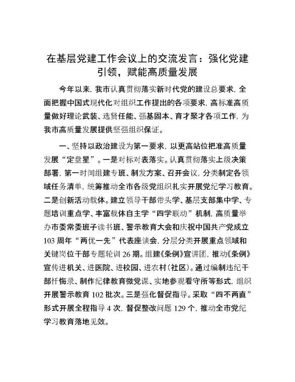 在基层党建工作会议上的交流发言:强化党建引领,赋能高质量发展 2024-09-15 Word模板 102 购买前,请一定要先点击这里看看,欢迎持续关注,精彩模板每天推送 预览结束,本文件为word文档,一共4页,共1515字,请购买后,下载后查看 购买前,请一定要先点击这里看看,欢迎持续关注,精彩模板每天推送 资源下载下载价格29 RMBVIP免费升级VIP点击检测网盘有效后购买有任何充值和下载问题请加微信:xuexixuexi66 0 演讲发言