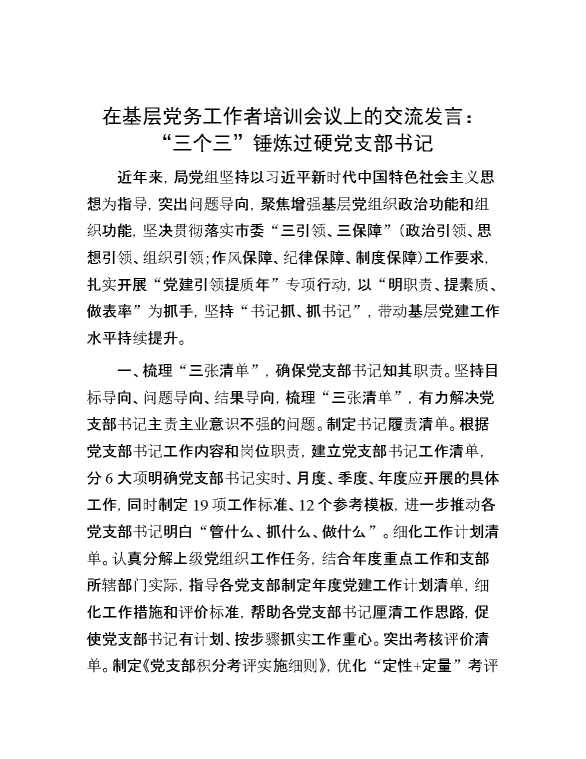在基层党务工作者培训会议上的交流发言:“三个三”锤炼过硬党支部书记 2024-09-15 Word模板 77 购买前,请一定要先点击这里看看,欢迎持续关注,精彩模板每天推送 预览结束,本文件为word文档,一共3页,共1457字,请购买后,下载后查看 购买前,请一定要先点击这里看看,欢迎持续关注,精彩模板每天推送 资源下载下载价格29 RMBVIP免费升级VIP点击检测网盘有效后购买有任何充值和下载问题请加微信:xuexixuexi66 0 演讲发言