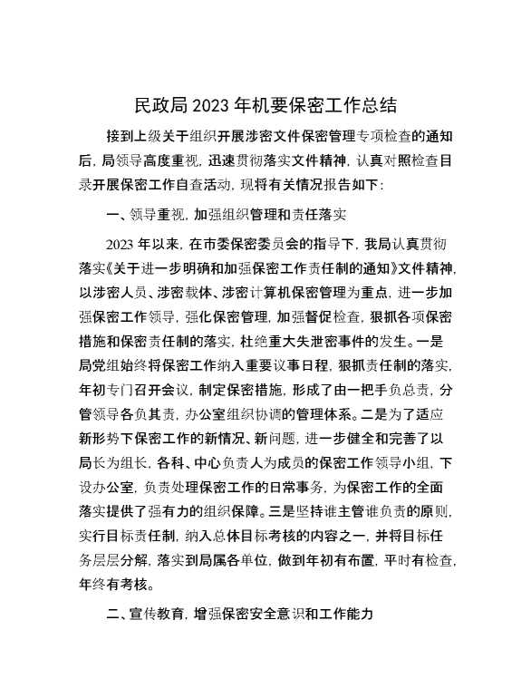民政局2023年机要保密工作总结 2024-09-15 Word模板 91 购买前,请一定要先点击这里看看,欢迎持续关注,精彩模板每天推送 预览结束,本文件为word文档,一共4页,共2013字,请购买后,下载后查看 购买前,请一定要先点击这里看看,欢迎持续关注,精彩模板每天推送 资源下载下载价格29 RMBVIP免费升级VIP点击检测网盘有效后购买有任何充值和下载问题请加微信:xuexixuexi66 0 总结汇报