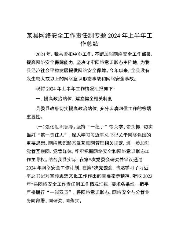 某县网络安全工作责任制专题2024年上半年工作总结 2024-09-15 Word模板 105 购买前,请一定要先点击这里看看,欢迎持续关注,精彩模板每天推送 预览结束,本文件为word文档,一共5页,共2240字,请购买后,下载后查看 购买前,请一定要先点击这里看看,欢迎持续关注,精彩模板每天推送 资源下载下载价格29 RMBVIP免费升级VIP点击检测网盘有效后购买有任何充值和下载问题请加微信:xuexixuexi66 0 总结汇报
