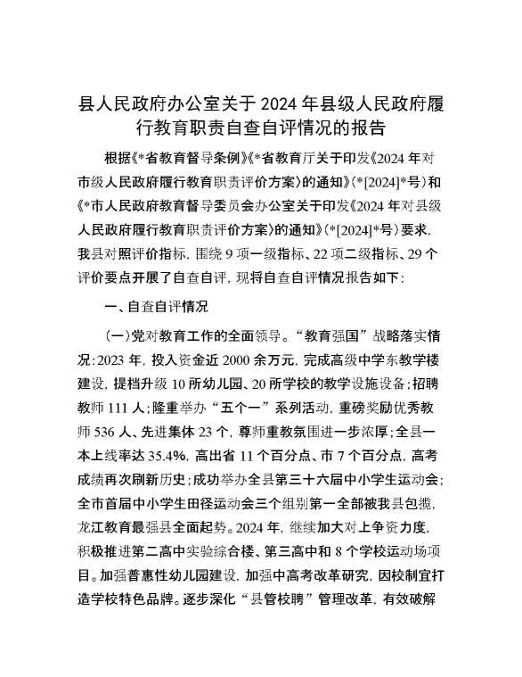 县人民政府办公室关于2024年县级人民政府履行教育职责自查自评情况的报告 2024-09-15 Word模板 87 购买前,请一定要先点击这里看看,欢迎持续关注,精彩模板每天推送 预览结束,本文件为word文档,一共18页,共9595字,请购买后,下载后查看 购买前,请一定要先点击这里看看,欢迎持续关注,精彩模板每天推送 资源下载下载价格29 RMBVIP免费升级VIP点击检测网盘有效后购买有任何充值和下载问题请加微信:xuexixuexi66 0 总结汇报