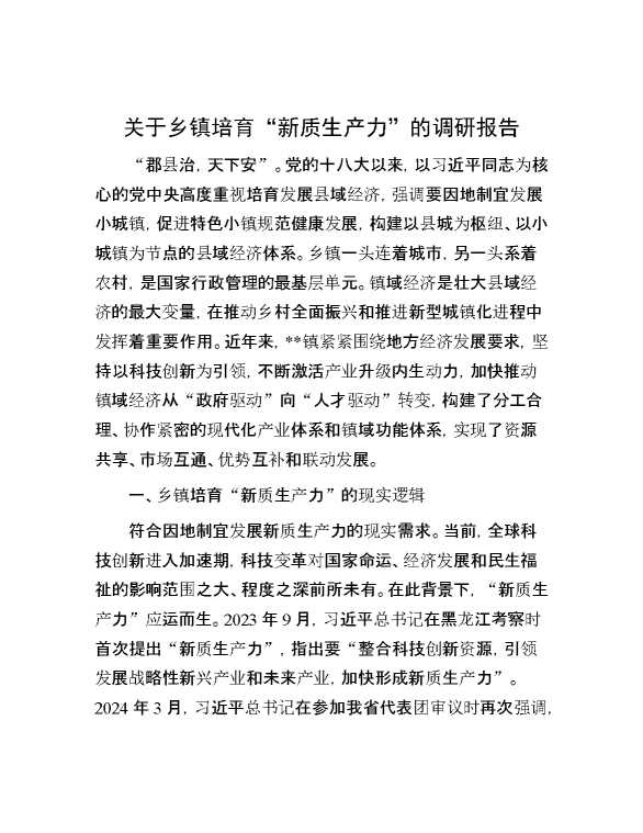 关于乡镇培育“新质生产力”的调研报告 2024-09-19 Word模板 74 购买前,请一定要先点击这里看看,欢迎持续关注,精彩模板每天推送 预览结束,本文件为word文档,一共8页,共3983字,请购买后,下载后查看 购买前,请一定要先点击这里看看,欢迎持续关注,精彩模板每天推送 资源下载下载价格29 RMBVIP免费升级VIP点击检测网盘有效后购买有任何充值和下载问题请加微信:xuexixuexi66 0 总结汇报