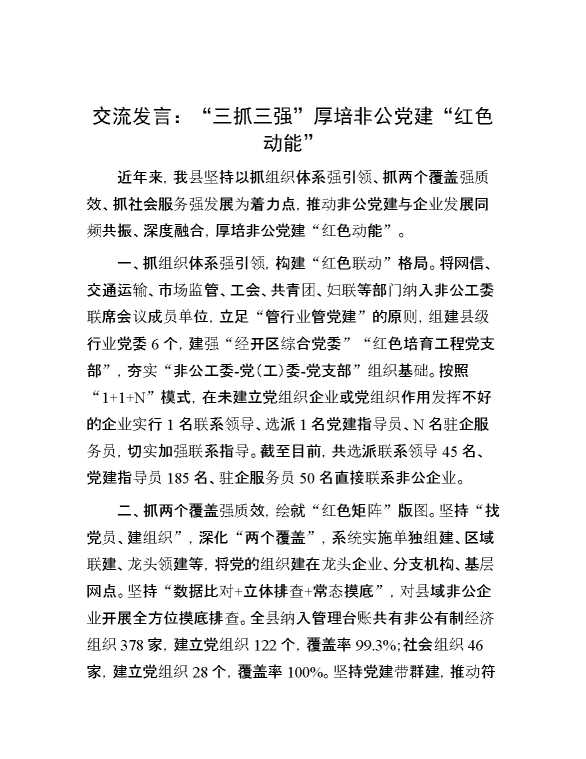交流发言:“三抓三强”厚培非公党建“红色动能” 2024-09-19 Word模板 77 购买前,请一定要先点击这里看看,欢迎持续关注,精彩模板每天推送 预览结束,本文件为word文档,一共2页,共717字,请购买后,下载后查看 购买前,请一定要先点击这里看看,欢迎持续关注,精彩模板每天推送 资源下载下载价格29 RMBVIP免费升级VIP点击检测网盘有效后购买有任何充值和下载问题请加微信:xuexixuexi66 0 演讲发言