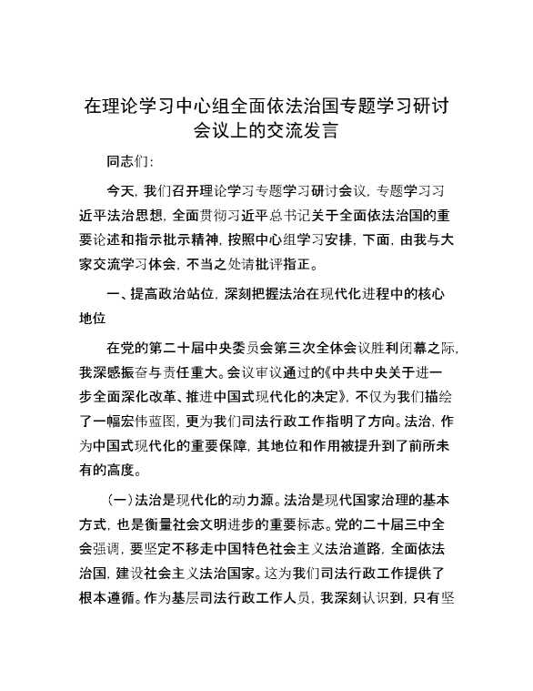 在理论学习中心组全面依法治国专题学习研讨会议上的交流发言 2024-09-19 Word模板 71 购买前,请一定要先点击这里看看,欢迎持续关注,精彩模板每天推送 预览结束,本文件为word文档,一共4页,共1805字,请购买后,下载后查看 购买前,请一定要先点击这里看看,欢迎持续关注,精彩模板每天推送 资源下载下载价格29 RMBVIP免费升级VIP点击检测网盘有效后购买有任何充值和下载问题请加微信:xuexixuexi66 0 演讲发言