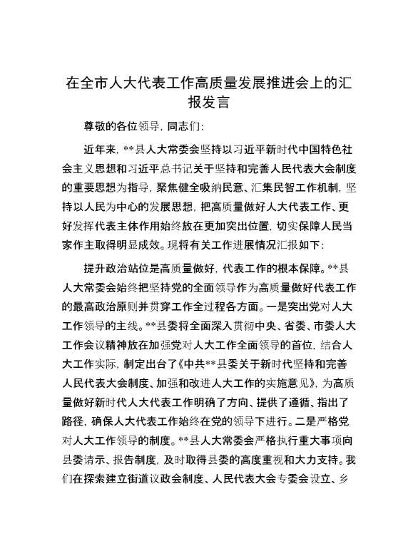 在全市人大代表工作高质量发展推进会上的汇报发言 2024-09-23 Word模板 101 购买前,请一定要先点击这里看看,欢迎持续关注,精彩模板每天推送 预览结束,本文件为word文档,一共6页,共2891字,请购买后,下载后查看 购买前,请一定要先点击这里看看,欢迎持续关注,精彩模板每天推送 资源下载下载价格29 RMBVIP免费升级VIP点击检测网盘有效后购买有任何充值和下载问题请加微信:xuexixuexi66 0 演讲发言