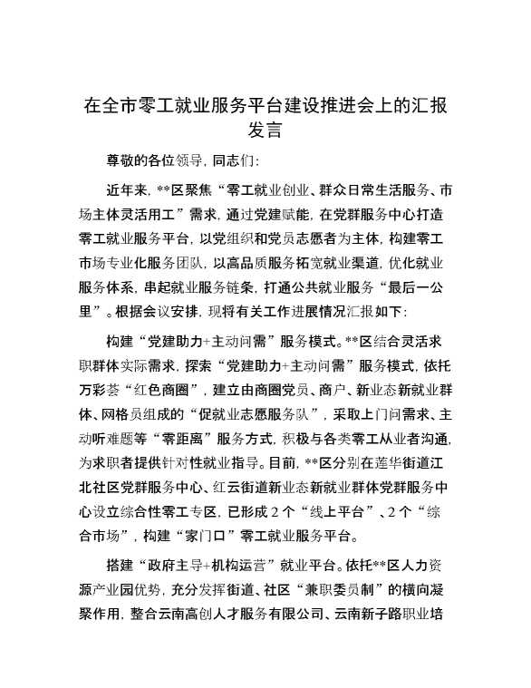 在全市零工就业服务平台建设推进会上的汇报发言 2024-09-23 Word模板 93 购买前,请一定要先点击这里看看,欢迎持续关注,精彩模板每天推送 预览结束,本文件为word文档,一共3页,共1122字,请购买后,下载后查看 购买前,请一定要先点击这里看看,欢迎持续关注,精彩模板每天推送 资源下载下载价格29 RMBVIP免费升级VIP点击检测网盘有效后购买有任何充值和下载问题请加微信:xuexixuexi66 0 演讲发言