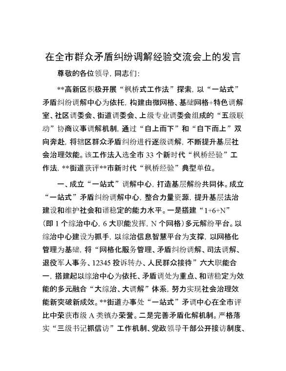 在全市群众矛盾纠纷调解经验交流会上的发言 2024-09-23 Word模板 97 购买前,请一定要先点击这里看看,欢迎持续关注,精彩模板每天推送 预览结束,本文件为word文档,一共3页,共1429字,请购买后,下载后查看 购买前,请一定要先点击这里看看,欢迎持续关注,精彩模板每天推送 资源下载下载价格29 RMBVIP免费升级VIP点击检测网盘有效后购买有任何充值和下载问题请加微信:xuexixuexi66 0 演讲发言