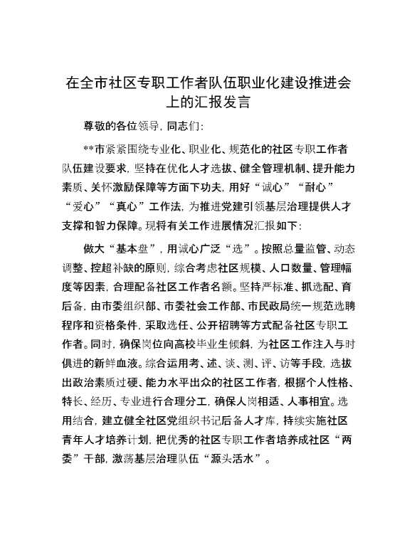 在全市社区专职工作者队伍职业化建设推进会上的汇报发言 2024-09-23 Word模板 88 购买前,请一定要先点击这里看看,欢迎持续关注,精彩模板每天推送 预览结束,本文件为word文档,一共3页,共1246字,请购买后,下载后查看 购买前,请一定要先点击这里看看,欢迎持续关注,精彩模板每天推送 资源下载下载价格29 RMBVIP免费升级VIP点击检测网盘有效后购买有任何充值和下载问题请加微信:xuexixuexi66 0 演讲发言