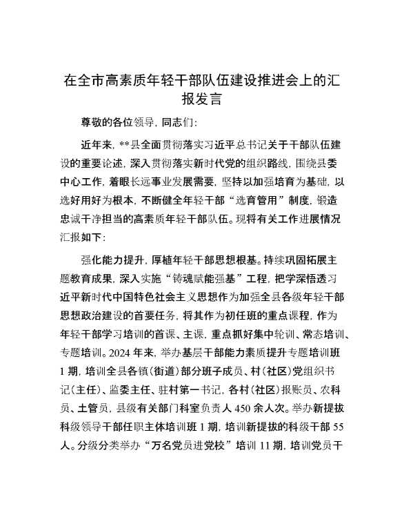 在全市高素质年轻干部队伍建设推进会上的汇报发言 2024-09-23 Word模板 98 购买前,请一定要先点击这里看看,欢迎持续关注,精彩模板每天推送 预览结束,本文件为word文档,一共3页,共1386字,请购买后,下载后查看 购买前,请一定要先点击这里看看,欢迎持续关注,精彩模板每天推送 资源下载下载价格29 RMBVIP免费升级VIP点击检测网盘有效后购买有任何充值和下载问题请加微信:xuexixuexi66 0 演讲发言