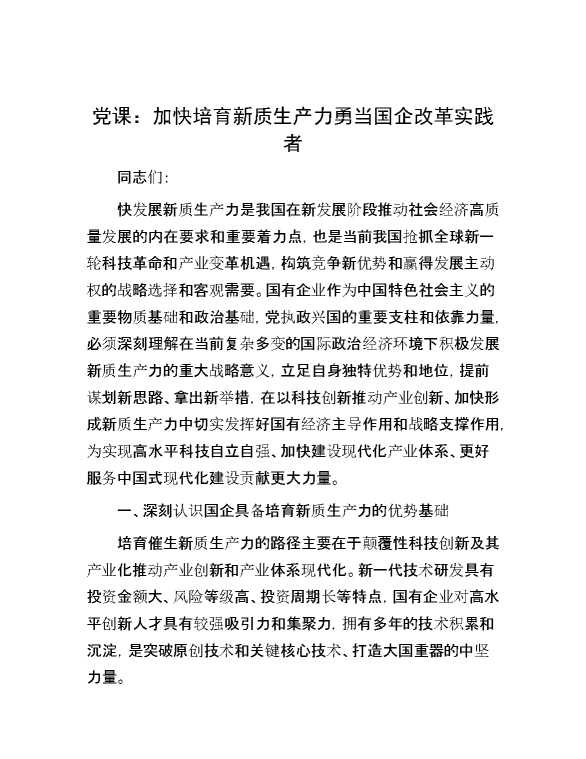 党课:加快培育新质生产力 勇当国企改革实践者 2024-09-23 Word模板 70 购买前,请一定要先点击这里看看,欢迎持续关注,精彩模板每天推送 预览结束,本文件为word文档,一共7页,共3573字,请购买后,下载后查看 购买前,请一定要先点击这里看看,欢迎持续关注,精彩模板每天推送 资源下载下载价格29 RMBVIP免费升级VIP点击检测网盘有效后购买有任何充值和下载问题请加微信:xuexixuexi66 0 党课及生活会