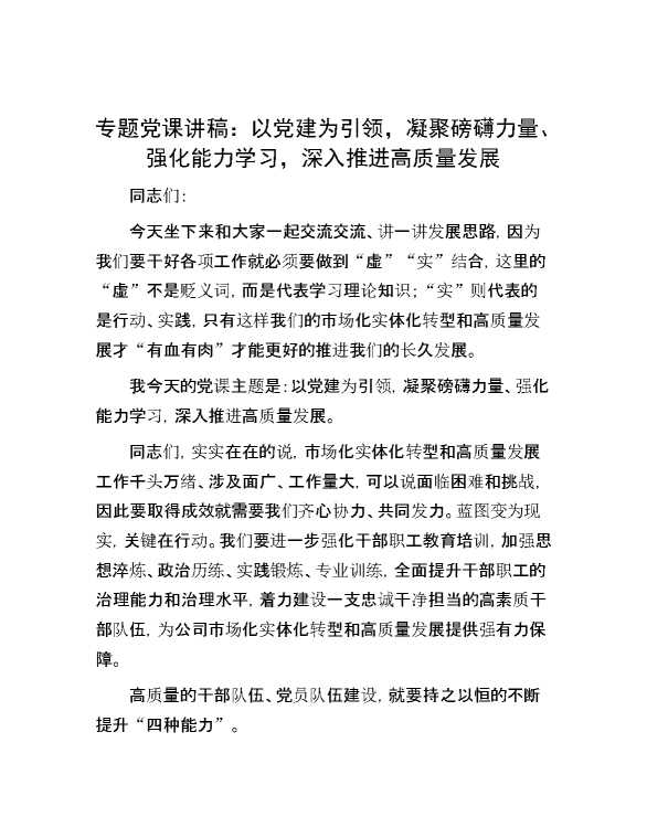专题党课讲稿:以党建为引领,凝聚磅礴力量、强化能力学习,深入推进高质量发展 2024-09-23 Word模板 70 购买前,请一定要先点击这里看看,欢迎持续关注,精彩模板每天推送 预览结束,本文件为word文档,一共5页,共2134字,请购买后,下载后查看 购买前,请一定要先点击这里看看,欢迎持续关注,精彩模板每天推送 资源下载下载价格29 RMBVIP免费升级VIP点击检测网盘有效后购买有任何充值和下载问题请加微信:xuexixuexi66 0 党课及生活会