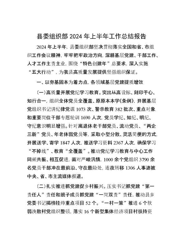 县委组织部2024年上半年工作总结报告 2024-09-25 Word模板 102 购买前,请一定要先点击这里看看,欢迎持续关注,精彩模板每天推送 预览结束,本文件为word文档,一共6页,共2780字,请购买后,下载后查看 购买前,请一定要先点击这里看看,欢迎持续关注,精彩模板每天推送 资源下载下载价格29 RMBVIP免费升级VIP点击检测网盘有效后购买有任何充值和下载问题请加微信:xuexixuexi66 0 总结汇报