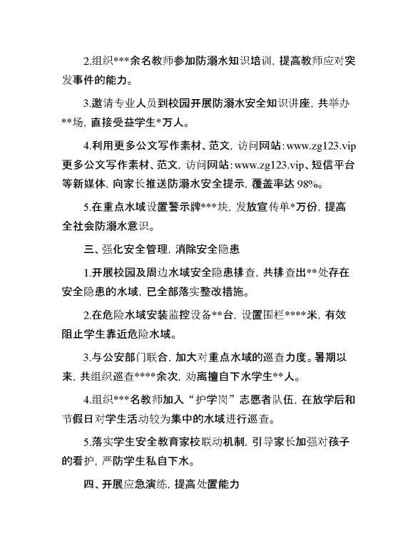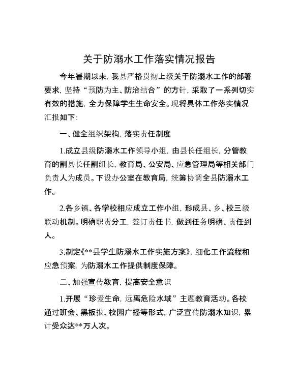 关于防溺水工作落实情况报告 2024-09-25 Word模板 106 购买前,请一定要先点击这里看看,欢迎持续关注,精彩模板每天推送 预览结束,本文件为word文档,一共5页,共1639字,请购买后,下载后查看 购买前,请一定要先点击这里看看,欢迎持续关注,精彩模板每天推送 资源下载下载价格29 RMBVIP免费升级VIP点击检测网盘有效后购买有任何充值和下载问题请加微信:xuexixuexi66 0 总结汇报