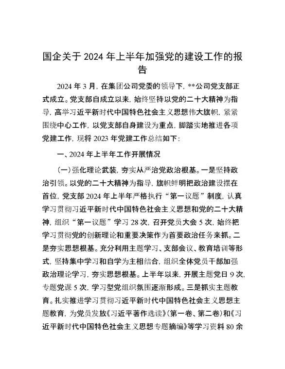 国企关于2024年上半年加强党的建设工作的报告 2024-09-26 Word模板 101 购买前,请一定要先点击这里看看,欢迎持续关注,精彩模板每天推送 预览结束,本文件为word文档,一共7页,共3198字,请购买后,下载后查看 购买前,请一定要先点击这里看看,欢迎持续关注,精彩模板每天推送 资源下载下载价格29 RMBVIP免费升级VIP立即购买有任何充值和下载问题请加微信:xuexixuexi66 0 总结汇报