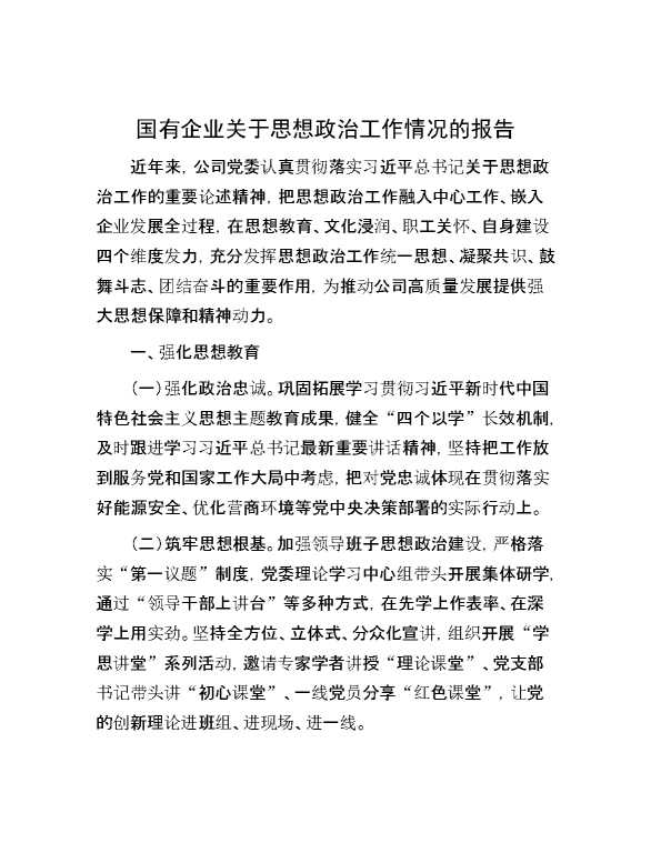 国有企业关于思想政治工作情况的报告 2024-09-26 Word模板 107 购买前,请一定要先点击这里看看,欢迎持续关注,精彩模板每天推送 预览结束,本文件为word文档,一共4页,共1813字,请购买后,下载后查看 购买前,请一定要先点击这里看看,欢迎持续关注,精彩模板每天推送 资源下载下载价格29 RMBVIP免费升级VIP立即购买有任何充值和下载问题请加微信:xuexixuexi66 0 总结汇报