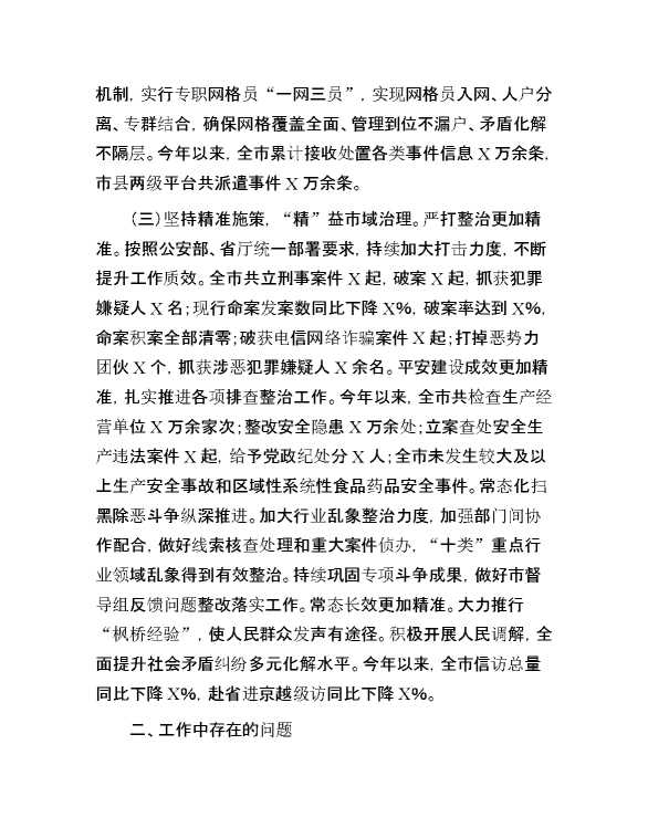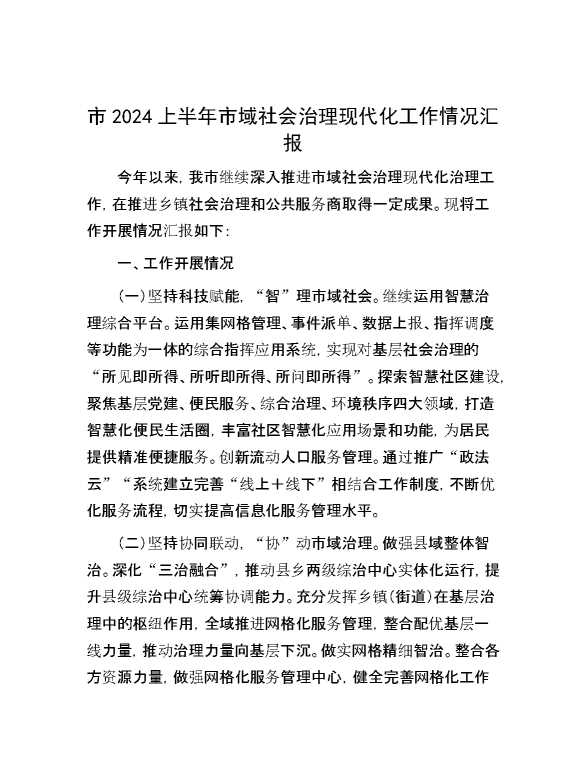 市2024上半年市域社会治理现代化工作情况汇报 2024-09-26 Word模板 98 购买前,请一定要先点击这里看看,欢迎持续关注,精彩模板每天推送 预览结束,本文件为word文档,一共4页,共1934字,请购买后,下载后查看 购买前,请一定要先点击这里看看,欢迎持续关注,精彩模板每天推送 资源下载下载价格29 RMBVIP免费升级VIP点击检测网盘有效后购买有任何充值和下载问题请加微信:xuexixuexi66 0 总结汇报