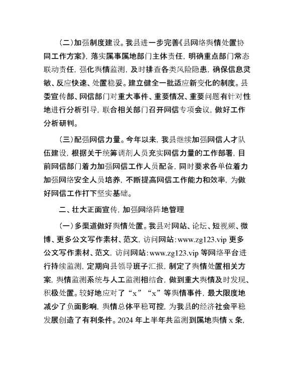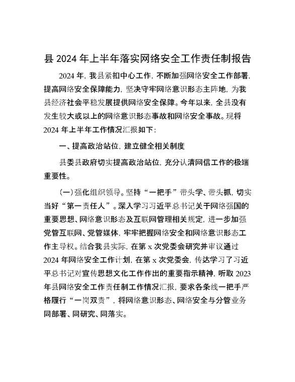 县2024年上半年落实网络安全工作责任制报告 2024-09-26 Word模板 103 购买前,请一定要先点击这里看看,欢迎持续关注,精彩模板每天推送 预览结束,本文件为word文档,一共5页,共2257字,请购买后,下载后查看 购买前,请一定要先点击这里看看,欢迎持续关注,精彩模板每天推送 资源下载下载价格29 RMBVIP免费升级VIP点击检测网盘有效后购买有任何充值和下载问题请加微信:xuexixuexi66 0 总结汇报