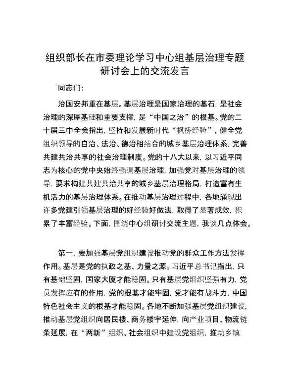 组织部长在市委理论学习中心组基层治理专题研讨会上的交流发言 2024-09-26 Word模板 128 购买前,请一定要先点击这里看看,欢迎持续关注,精彩模板每天推送 预览结束,本文件为word文档,一共6页,共2619字,请购买后,下载后查看 购买前,请一定要先点击这里看看,欢迎持续关注,精彩模板每天推送 资源下载下载价格29 RMBVIP免费升级VIP点击检测网盘有效后购买有任何充值和下载问题请加微信:xuexixuexi66 0 演讲发言