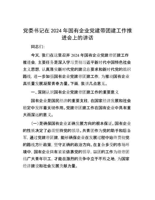 党委书记在2024年国有企业党建带团建工作推进会上的讲话 2024-09-26 Word模板 98 购买前,请一定要先点击这里看看,欢迎持续关注,精彩模板每天推送 预览结束,本文件为word文档,一共6页,共2846字,请购买后,下载后查看 购买前,请一定要先点击这里看看,欢迎持续关注,精彩模板每天推送 资源下载下载价格29 RMBVIP免费升级VIP点击检测网盘有效后购买有任何充值和下载问题请加微信:xuexixuexi66 0 演讲发言
