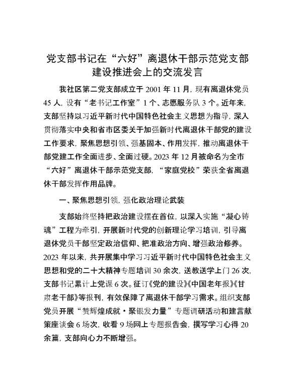党支部书记在“六好”离退休干部示范党支部建设推进会上的交流发言 2024-09-26 Word模板 99 购买前,请一定要先点击这里看看,欢迎持续关注,精彩模板每天推送 预览结束,本文件为word文档,一共3页,共1039字,请购买后,下载后查看 购买前,请一定要先点击这里看看,欢迎持续关注,精彩模板每天推送 资源下载下载价格29 RMBVIP免费升级VIP点击检测网盘有效后购买有任何充值和下载问题请加微信:xuexixuexi66 0 演讲发言