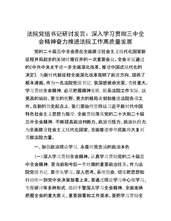 法院党组书记研讨发言:深入学习贯彻三中全会精神 奋力推进法院工作高质量发展 2024-09-26 Word模板 99 购买前,请一定要先点击这里看看,欢迎持续关注,精彩模板每天推送 预览结束,本文件为word文档,一共5页,共2133字,请购买后,下载后查看 购买前,请一定要先点击这里看看,欢迎持续关注,精彩模板每天推送 资源下载下载价格29 RMBVIP免费升级VIP点击检测网盘有效后购买有任何充值和下载问题请加微信:xuexixuexi66 0 演讲发言