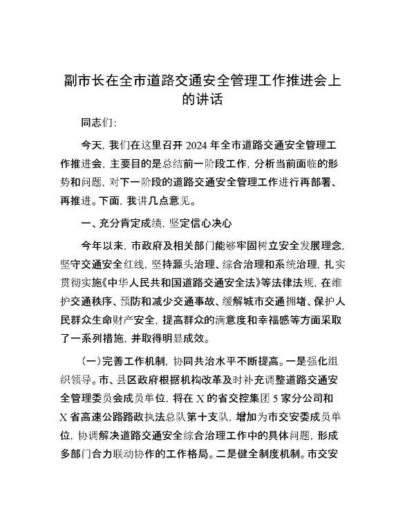 副市长在全市道路交通安全管理工作推进会上的讲话 2024-09-26 Word模板 104 购买前,请一定要先点击这里看看,欢迎持续关注,精彩模板每天推送 预览结束,本文件为word文档,一共10页,共4558字,请购买后,下载后查看 购买前,请一定要先点击这里看看,欢迎持续关注,精彩模板每天推送 资源下载下载价格29 RMBVIP免费升级VIP点击检测网盘有效后购买有任何充值和下载问题请加微信:xuexixuexi66 0 演讲发言