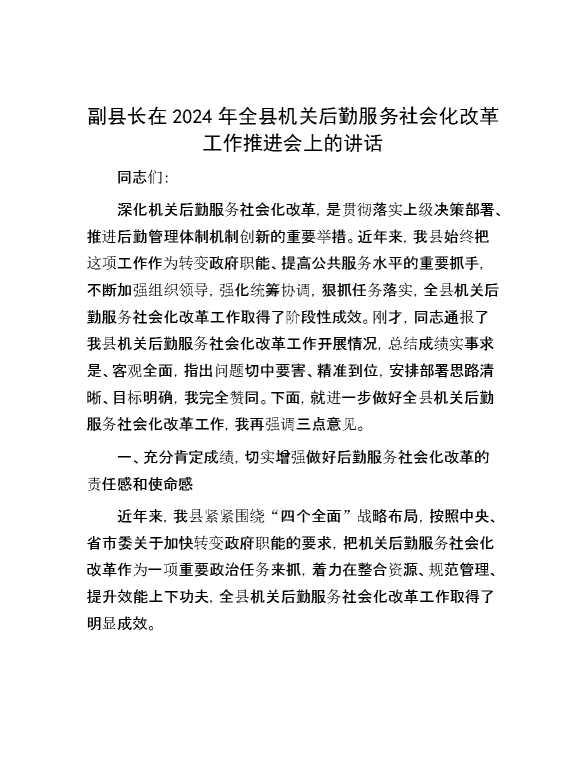 副县长在2024年全县机关后勤服务社会化改革工作推进会上的讲话 2024-09-26 Word模板 96 购买前,请一定要先点击这里看看,欢迎持续关注,精彩模板每天推送 预览结束,本文件为word文档,一共5页,共2236字,请购买后,下载后查看 购买前,请一定要先点击这里看看,欢迎持续关注,精彩模板每天推送 资源下载下载价格29 RMBVIP免费升级VIP点击检测网盘有效后购买有任何充值和下载问题请加微信:xuexixuexi66 0 演讲发言