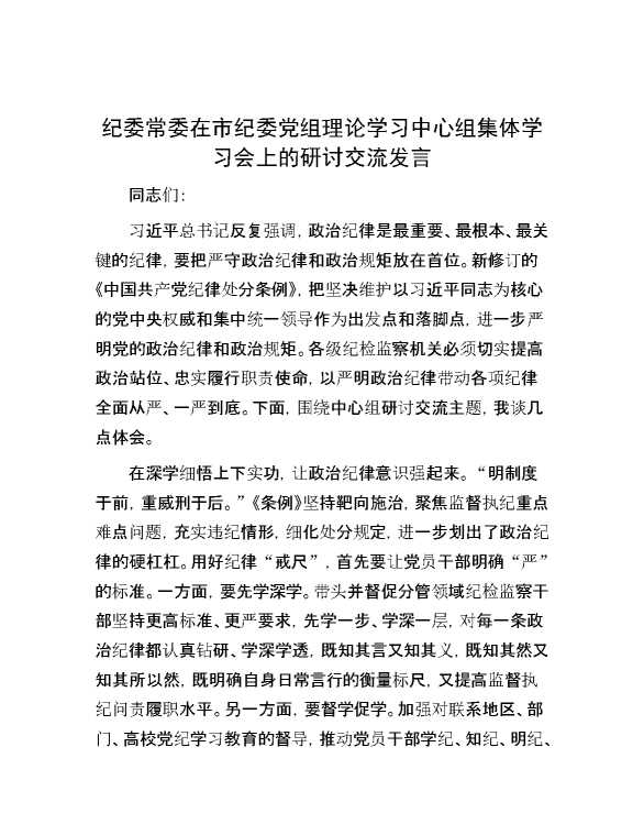 纪委常委在市纪委党组理论学习中心组集体学习会上的研讨交流发言 2024-09-26 Word模板 92 购买前,请一定要先点击这里看看,欢迎持续关注,精彩模板每天推送 预览结束,本文件为word文档,一共3页,共1281字,请购买后,下载后查看 购买前,请一定要先点击这里看看,欢迎持续关注,精彩模板每天推送 资源下载下载价格29 RMBVIP免费升级VIP点击检测网盘有效后购买有任何充值和下载问题请加微信:xuexixuexi66 0 演讲发言