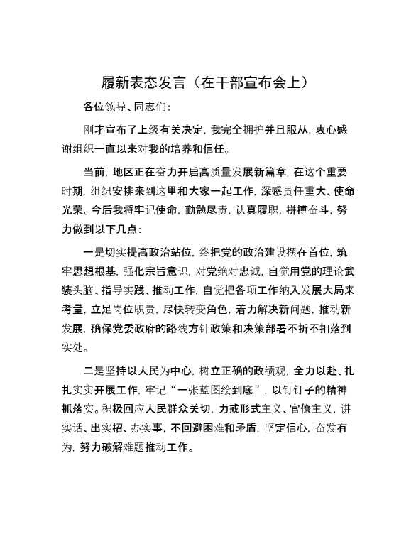 履新表态发言(在干部宣布会上) 2024-09-26 Word模板 96 购买前,请一定要先点击这里看看,欢迎持续关注,精彩模板每天推送 预览结束,本文件为word文档,一共2页,共588字,请购买后,下载后查看 购买前,请一定要先点击这里看看,欢迎持续关注,精彩模板每天推送 资源下载下载价格29 RMBVIP免费升级VIP点击检测网盘有效后购买有任何充值和下载问题请加微信:xuexixuexi66 0 演讲发言