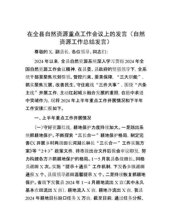 在全县自然资源重点工作会议上的发言(自然资源工作总结发言) 2024-09-26 Word模板 71 购买前,请一定要先点击这里看看,欢迎持续关注,精彩模板每天推送 预览结束,本文件为word文档,一共9页,共4300字,请购买后,下载后查看 购买前,请一定要先点击这里看看,欢迎持续关注,精彩模板每天推送 资源下载下载价格29 RMBVIP免费升级VIP点击检测网盘有效后购买有任何充值和下载问题请加微信:xuexixuexi66 0 演讲发言