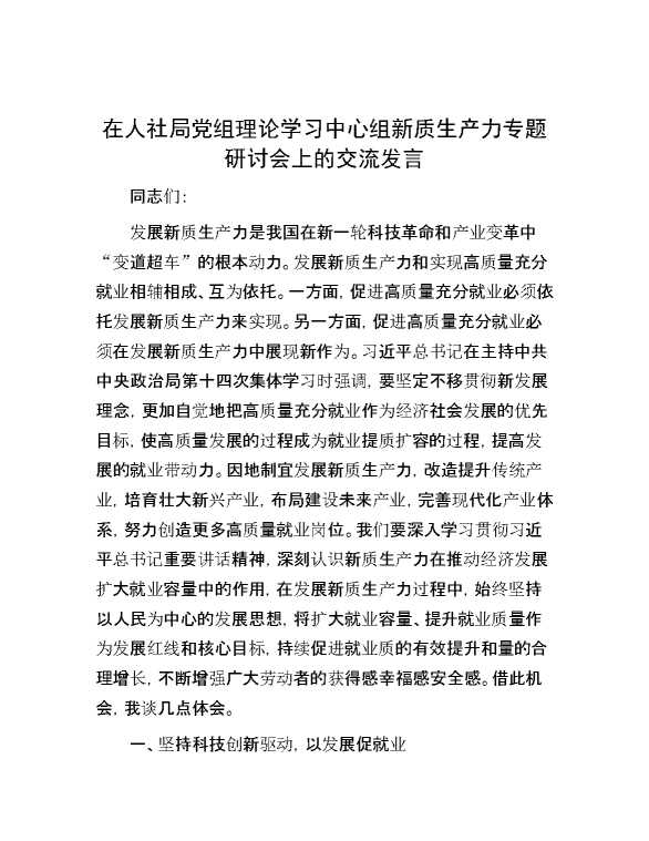 在人社局党组理论学习中心组新质生产力专题研讨会上的交流发言 2024-09-26 Word模板 68 购买前,请一定要先点击这里看看,欢迎持续关注,精彩模板每天推送 预览结束,本文件为word文档,一共6页,共2740字,请购买后,下载后查看 购买前,请一定要先点击这里看看,欢迎持续关注,精彩模板每天推送 资源下载下载价格29 RMBVIP免费升级VIP点击检测网盘有效后购买有任何充值和下载问题请加微信:xuexixuexi66 0 演讲发言