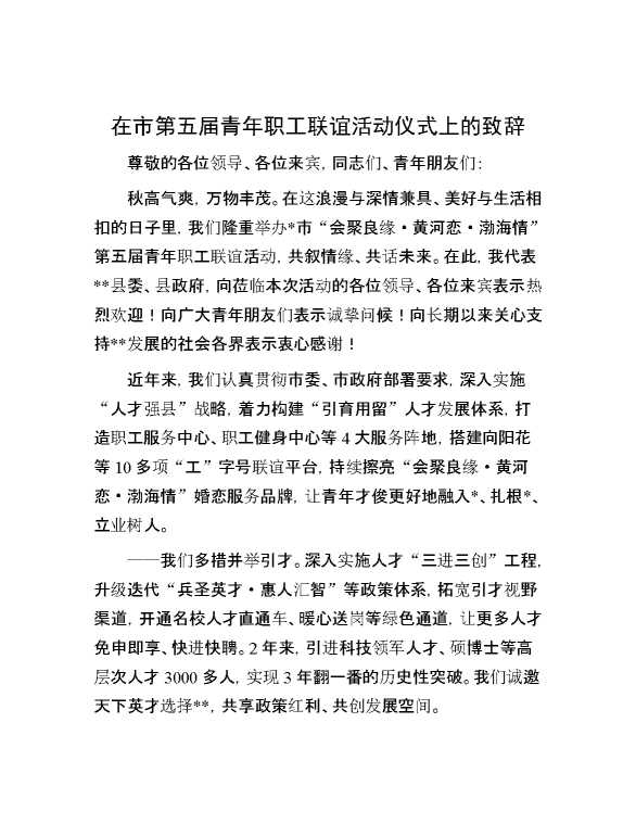 在市第五届青年职工联谊活动仪式上的致辞 2024-09-26 Word模板 96 购买前,请一定要先点击这里看看,欢迎持续关注,精彩模板每天推送 预览结束,本文件为word文档,一共3页,共1249字,请购买后,下载后查看 购买前,请一定要先点击这里看看,欢迎持续关注,精彩模板每天推送 资源下载下载价格29 RMBVIP免费升级VIP点击检测网盘有效后购买有任何充值和下载问题请加微信:xuexixuexi66 0 演讲发言