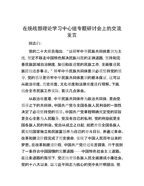 在统战部理论学习中心组专题研讨会上的交流发言 2024-09-26 Word模板 69 购买前,请一定要先点击这里看看,欢迎持续关注,精彩模板每天推送 预览结束,本文件为word文档,一共4页,共2009字,请购买后,下载后查看 购买前,请一定要先点击这里看看,欢迎持续关注,精彩模板每天推送 资源下载下载价格29 RMBVIP免费升级VIP点击检测网盘有效后购买有任何充值和下载问题请加微信:xuexixuexi66 0 演讲发言
