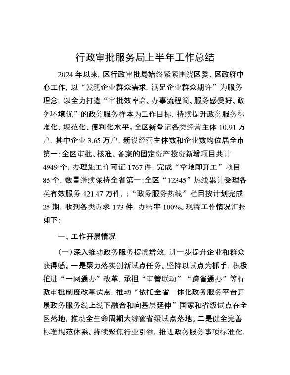 行政审批服务局上半年工作总结 2024-09-27 Word模板 74 购买前,请一定要先点击这里看看,欢迎持续关注,精彩模板每天推送 预览结束,本文件为word文档,一共5页,共2352字,请购买后,下载后查看 购买前,请一定要先点击这里看看,欢迎持续关注,精彩模板每天推送 资源下载下载价格29 RMBVIP免费升级VIP点击检测网盘有效后购买有任何充值和下载问题请加微信:xuexixuexi66 0 总结汇报