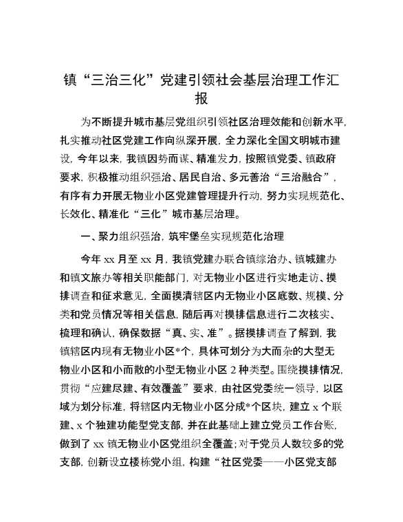 镇“三治三化”党建引领社会基层治理工作汇报 2024-09-27 Word模板 79 购买前,请一定要先点击这里看看,欢迎持续关注,精彩模板每天推送 预览结束,本文件为word文档,一共3页,共1414字,请购买后,下载后查看 购买前,请一定要先点击这里看看,欢迎持续关注,精彩模板每天推送 资源下载下载价格29 RMBVIP免费升级VIP点击检测网盘有效后购买有任何充值和下载问题请加微信:xuexixuexi66 0 总结汇报