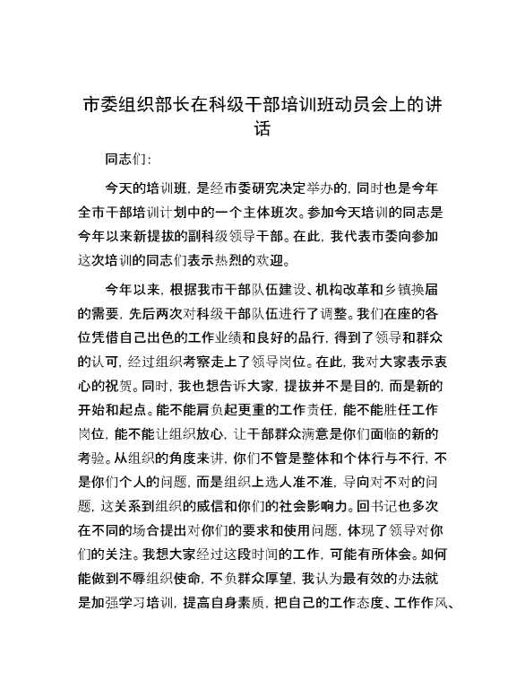 市委组织部长在科级干部培训班动员会上的讲话 2024-09-27 Word模板 71 购买前,请一定要先点击这里看看,欢迎持续关注,精彩模板每天推送 预览结束,本文件为word文档,一共7页,共3538字,请购买后,下载后查看 购买前,请一定要先点击这里看看,欢迎持续关注,精彩模板每天推送 资源下载下载价格29 RMBVIP免费升级VIP点击检测网盘有效后购买有任何充值和下载问题请加微信:xuexixuexi66 0 演讲发言