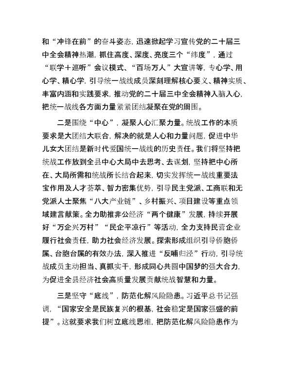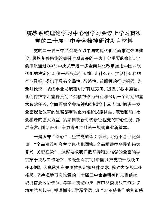 统战系统理论学习中心组学习会议上学习贯彻党的二十届三中全会精神研讨发言材料 2024-09-27 Word模板 70 购买前,请一定要先点击这里看看,欢迎持续关注,精彩模板每天推送 预览结束,本文件为word文档,一共4页,共1601字,请购买后,下载后查看 购买前,请一定要先点击这里看看,欢迎持续关注,精彩模板每天推送 资源下载下载价格29 RMBVIP免费升级VIP点击检测网盘有效后购买有任何充值和下载问题请加微信:xuexixuexi66 0 演讲发言
