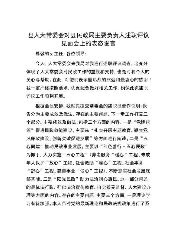 县人大常委会对县民政局主要负责人述职评议见面会上的表态发言 2024-09-27 Word模板 83 购买前,请一定要先点击这里看看,欢迎持续关注,精彩模板每天推送 预览结束,本文件为word文档,一共3页,共1413字,请购买后,下载后查看 购买前,请一定要先点击这里看看,欢迎持续关注,精彩模板每天推送 资源下载下载价格29 RMBVIP免费升级VIP点击检测网盘有效后购买有任何充值和下载问题请加微信:xuexixuexi66 0 演讲发言
