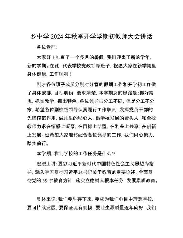 乡中学2024年秋季开学学期初教师大会讲话 2024-09-27 Word模板 75 购买前,请一定要先点击这里看看,欢迎持续关注,精彩模板每天推送 预览结束,本文件为word文档,一共9页,共3670字,请购买后,下载后查看 购买前,请一定要先点击这里看看,欢迎持续关注,精彩模板每天推送 资源下载下载价格29 RMBVIP免费升级VIP点击检测网盘有效后购买有任何充值和下载问题请加微信:xuexixuexi66 0 演讲发言