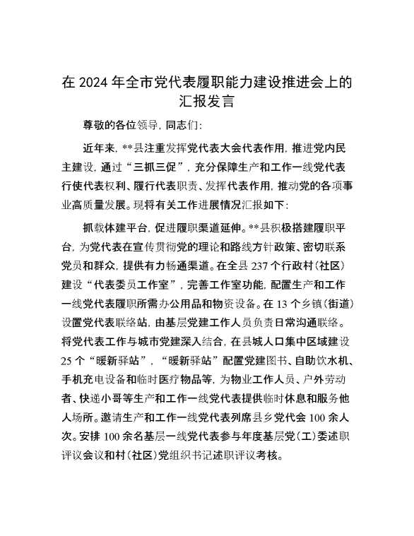 在2024年全市党代表履职能力建设推进会上的汇报发言 2024-09-27 Word模板 134 购买前,请一定要先点击这里看看,欢迎持续关注,精彩模板每天推送 预览结束,本文件为word文档,一共3页,共1145字,请购买后,下载后查看 购买前,请一定要先点击这里看看,欢迎持续关注,精彩模板每天推送 资源下载下载价格29 RMBVIP免费升级VIP点击检测网盘有效后购买有任何充值和下载问题请加微信:xuexixuexi66 0 演讲发言