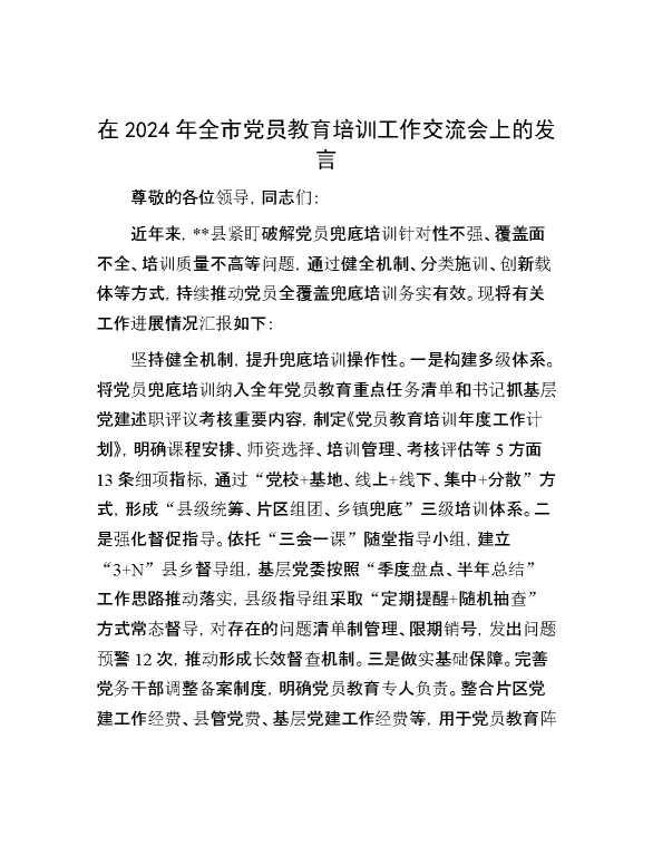 在2024年全市党员教育培训工作交流会上的发言 2024-09-27 Word模板 104 购买前,请一定要先点击这里看看,欢迎持续关注,精彩模板每天推送 预览结束,本文件为word文档,一共3页,共1297字,请购买后,下载后查看 购买前,请一定要先点击这里看看,欢迎持续关注,精彩模板每天推送 资源下载下载价格29 RMBVIP免费升级VIP点击检测网盘有效后购买有任何充值和下载问题请加微信:xuexixuexi66 0 演讲发言