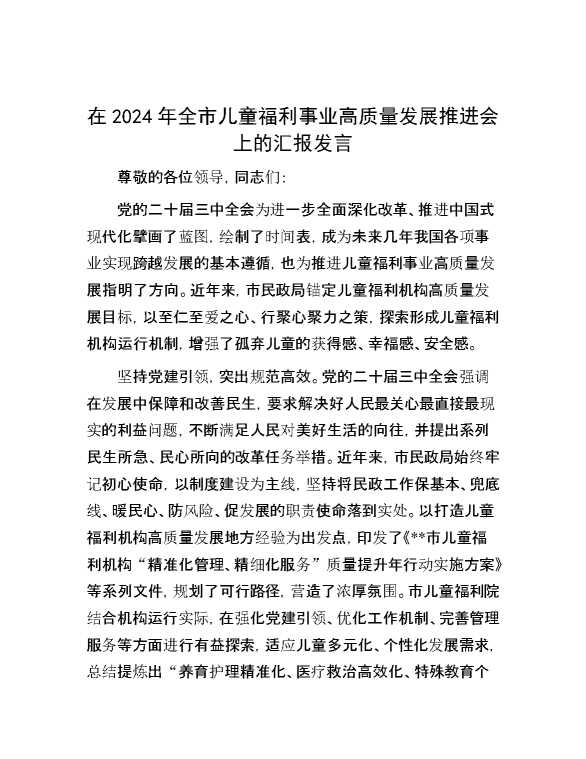 在2024年全市儿童福利事业高质量发展推进会上的汇报发言 2024-09-27 Word模板 98 购买前,请一定要先点击这里看看,欢迎持续关注,精彩模板每天推送 预览结束,本文件为word文档,一共4页,共1592字,请购买后,下载后查看 购买前,请一定要先点击这里看看,欢迎持续关注,精彩模板每天推送 资源下载下载价格29 RMBVIP免费升级VIP点击检测网盘有效后购买有任何充值和下载问题请加微信:xuexixuexi66 0 演讲发言
