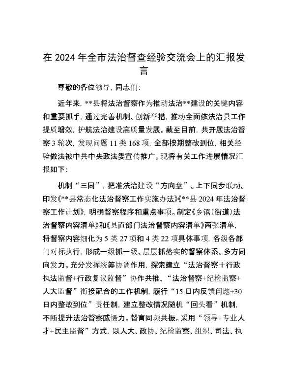 在2024年全市法治督查经验交流会上的汇报发言 2024-09-27 Word模板 109 购买前,请一定要先点击这里看看,欢迎持续关注,精彩模板每天推送 预览结束,本文件为word文档,一共3页,共1238字,请购买后,下载后查看 购买前,请一定要先点击这里看看,欢迎持续关注,精彩模板每天推送 资源下载下载价格29 RMBVIP免费升级VIP点击检测网盘有效后购买有任何充值和下载问题请加微信:xuexixuexi66 0 演讲发言