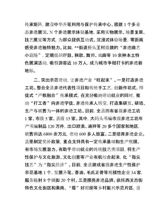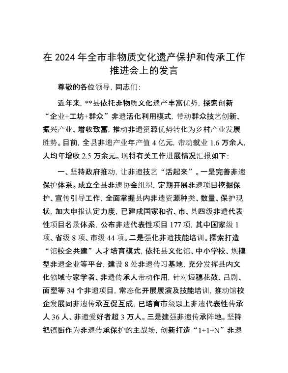 在2024年全市非物质文化遗产保护和传承工作推进会上的发言 2024-09-27 Word模板 143 购买前,请一定要先点击这里看看,欢迎持续关注,精彩模板每天推送 预览结束,本文件为word文档,一共4页,共1817字,请购买后,下载后查看 购买前,请一定要先点击这里看看,欢迎持续关注,精彩模板每天推送 资源下载下载价格29 RMBVIP免费升级VIP点击检测网盘有效后购买有任何充值和下载问题请加微信:xuexixuexi66 0 演讲发言